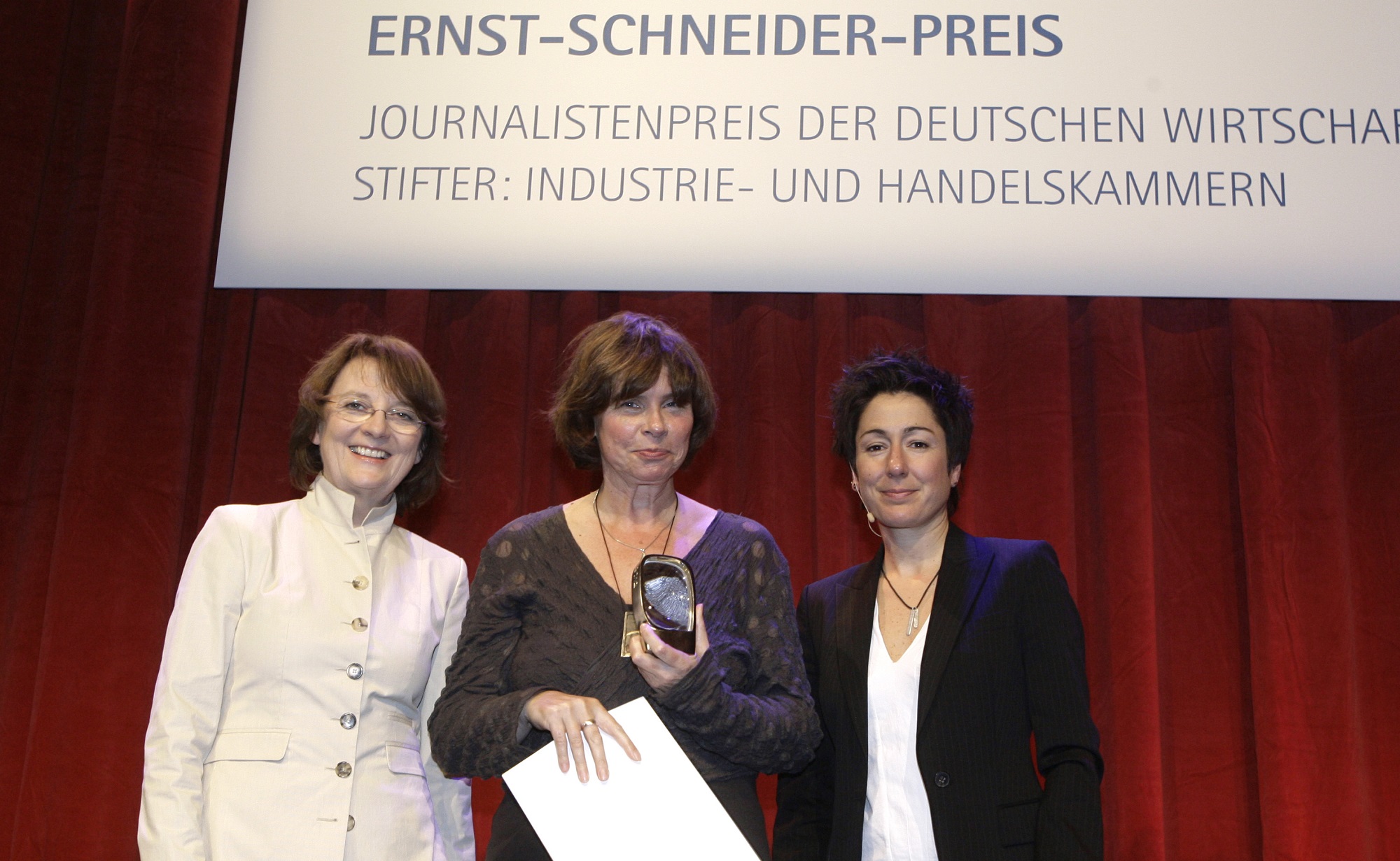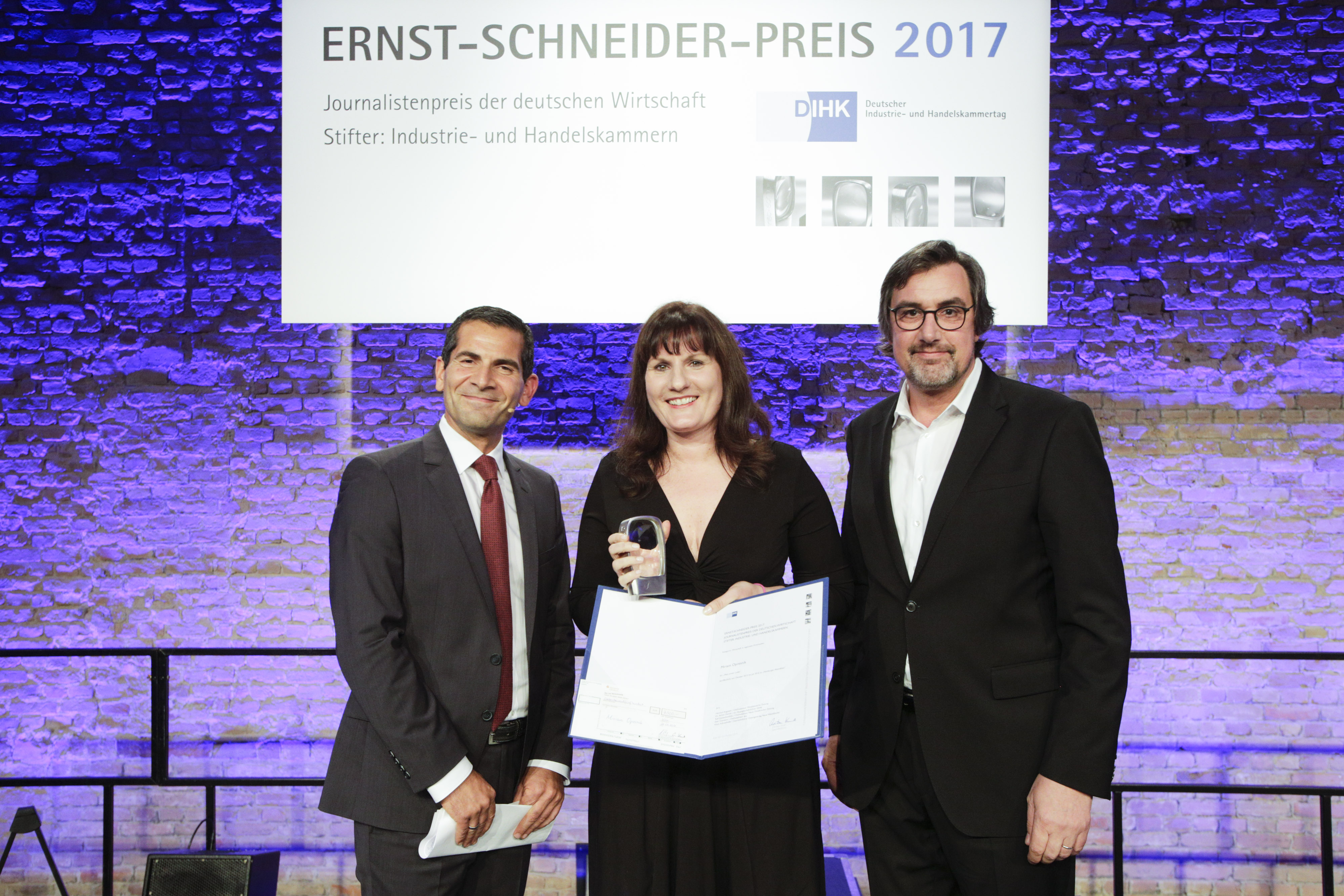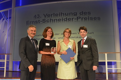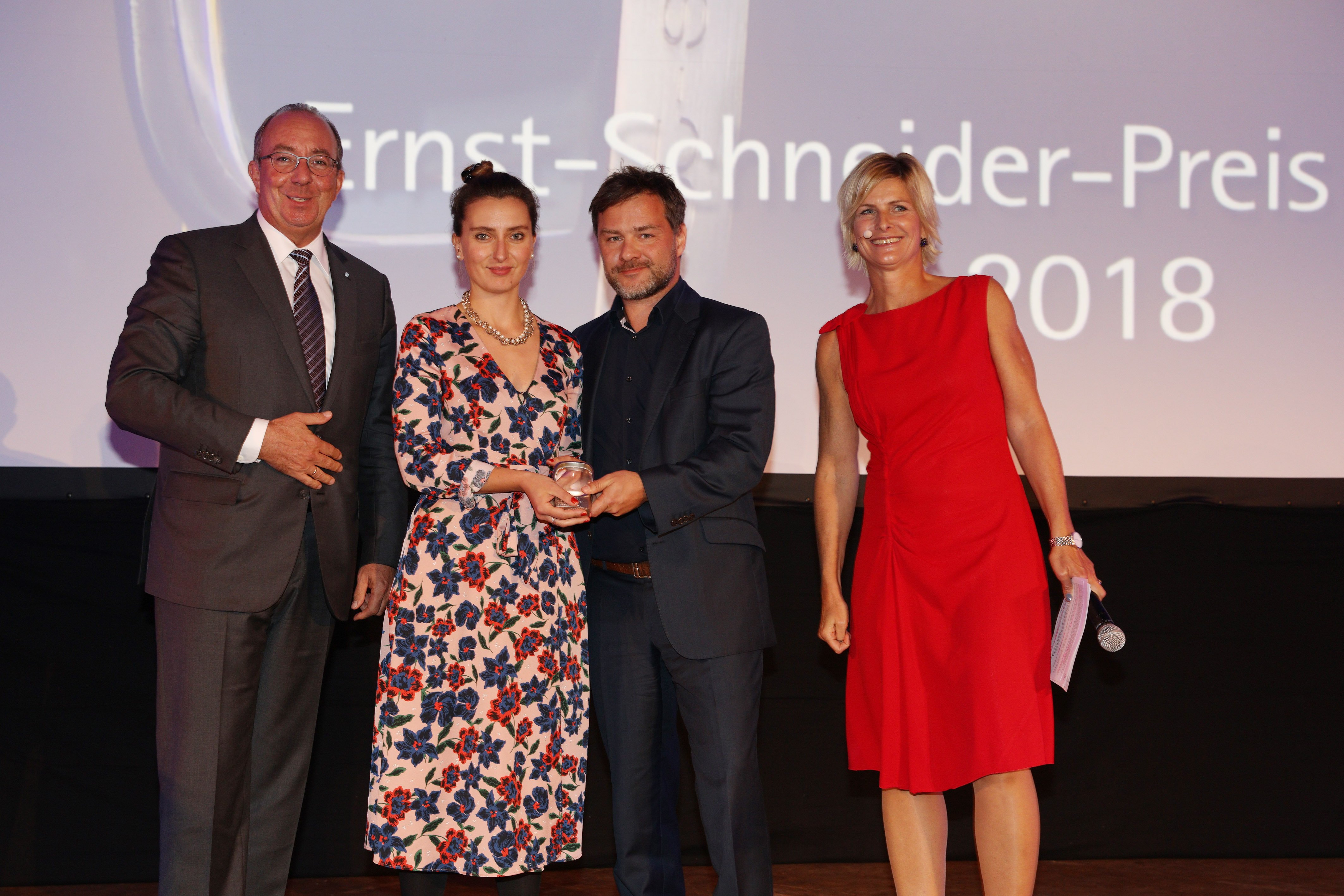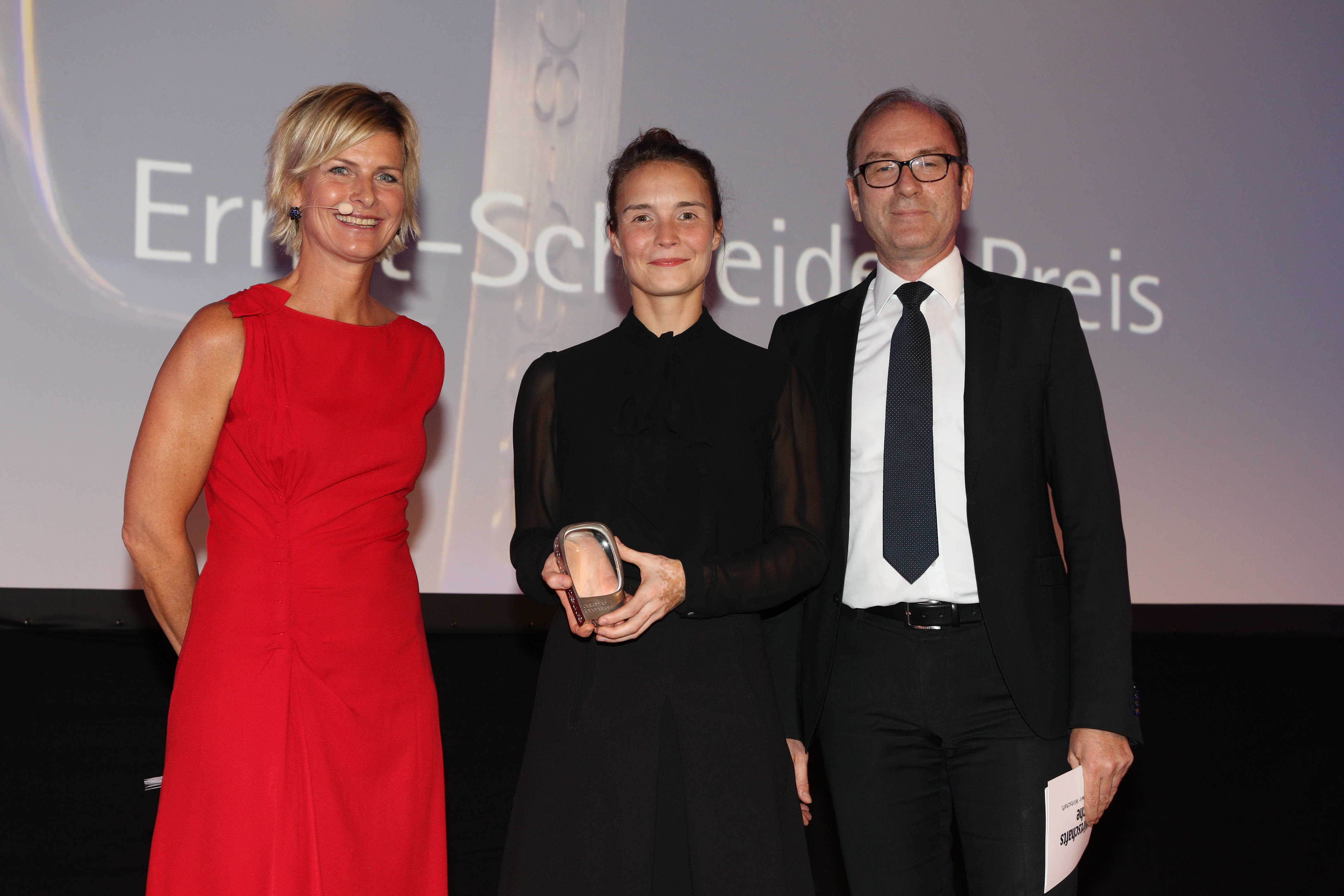 Constanze Freriks, Hartmut Spiesecke, Geschäftsfürer des Ernst-Schneider-Preises, und Moderatorin Katty Salié
