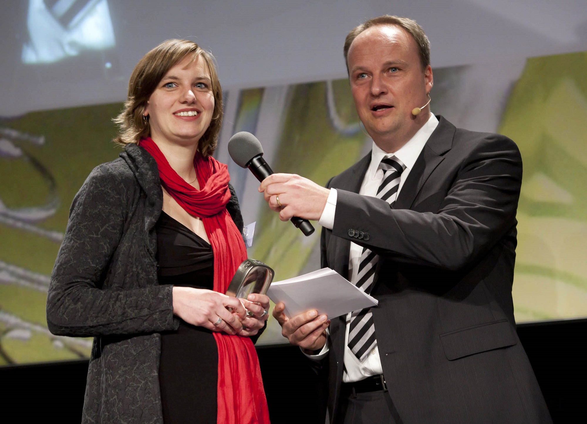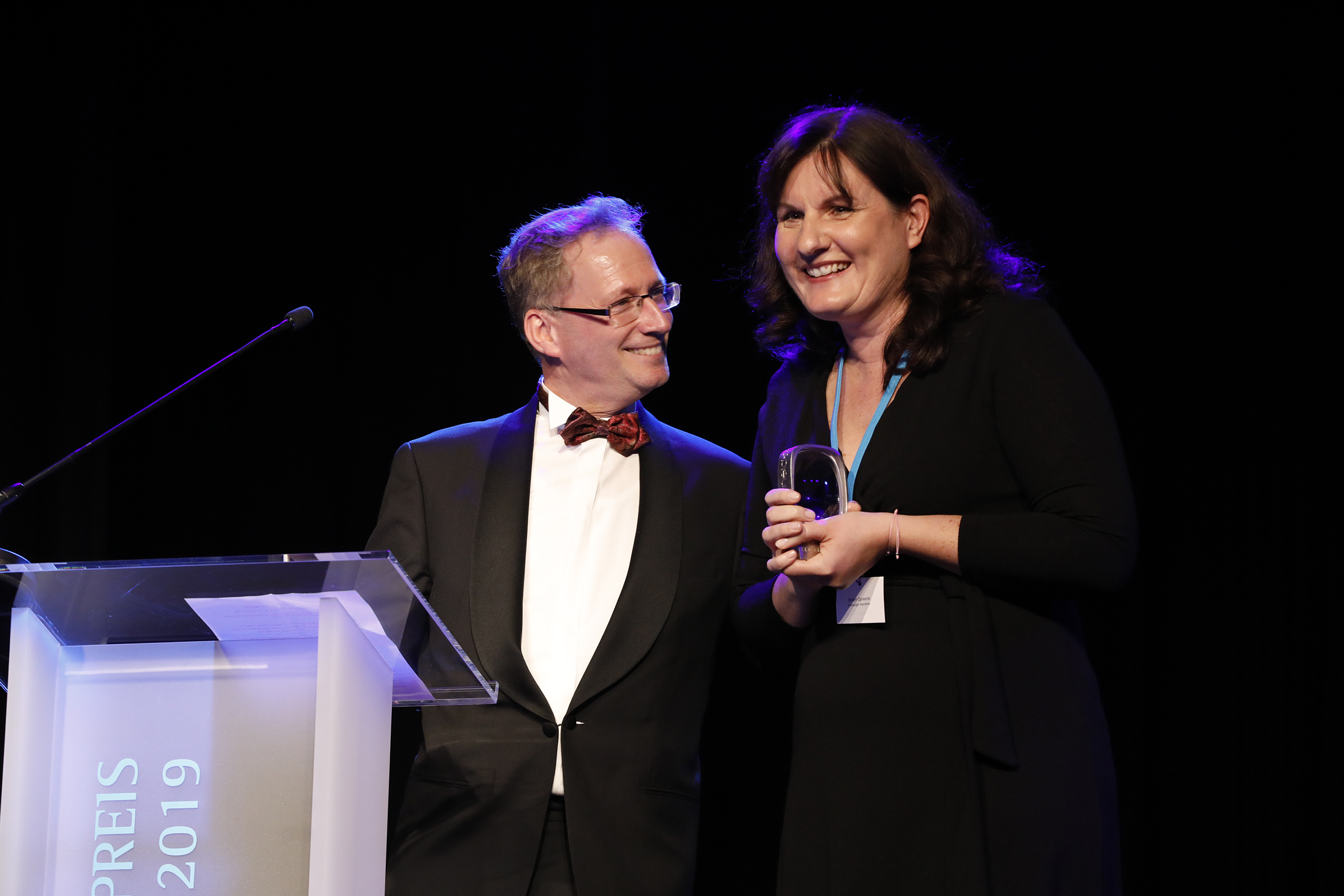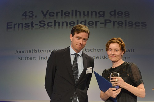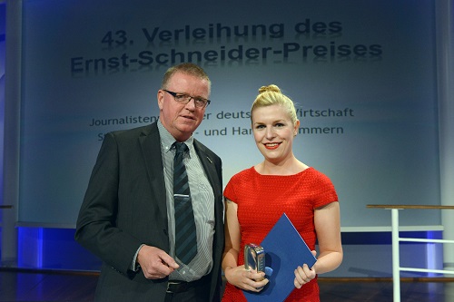 Preisträgerin Petra Sorge und Laudator Sven Afhüppe, Chefredakteur des Handelsblatt